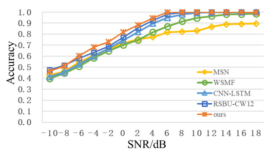 Figure 7 shows the recognition accuracy curve of different network models with the change of SNR. It can be seen that the recognition accuracy of RSBU-CW12 is higher than that of other network models when SNR is from -10dB to 18dB. When SNR is 2dB, the recognition accuracy of RSBU-CW12 is more than 85%, while that of other network models is less than 80%. When SNR exceeds 8dB, recognition the accuracy is approximately 100%. Advantages of RSBU-CW12 network model in modulation recognition are further illustrated by analysis, which can be used as the basic feature extraction network in subsequent research.