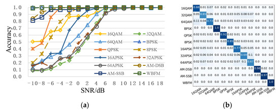 Figure 9 gives the recognition performance of the proposed scheme. Figure 9a shows the recognition accuracy curve of each modulation type. High-order modulation signals, such as 32QAM, 64QAM, 16APSK, 32APSK, and 64APSK, are very difficult to be recognized in the case of low SNR. When SNR is 6dB, recognition accuracy of all modulation types is more than 90%. Figure 9b shows the overall confusion matrix. The overall recognition accuracy of low-order modulation signals BPSK, QPSK, and analog modulation signals AM-DSB, AM-SSB, and FM is over 90% and close to 100%. The modulation order of QAM and APSK signals is higher than 16, and recognition accuracy is relatively low. Recognition accuracies of QAM, PSK, and APSK signals decrease with the increase of modulation order.