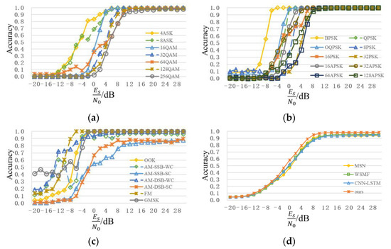 Figure 12 shows a recognition performance curve of the proposed scheme in the public dataset, RadioML2018.01A. To facilitate observation, the recognition results of all the modulation types are divided into ASK+QAM, PSK+APSK, and low order+analog in Figure 12a–c. Similar to the analysis results in Figure 9, compared with low-order modulation signals, such as OOK and BPSK, recognition of the high-order modulation signals, such as 128APSK and 256QAM is more difficult and its accuracy is relatively lower. When SNR is 4dB, except for 16PSK (75%), recognition accuracies of other digital modulation signals of order 16 or less are over 90%, and recognition accuracies of OOK, BPSK, QPSK, 8PSK, and 16APSK are close to 100%. When SNR is 10dB, except for AM-DSB-SC (81.84%) and AM-SSB-SC (84.77%), recognition accuracies of other signals are more than 90%, and recognition accuracies of most signals can reach 100%; the recognition accuracy of 128APSK is 98.63%; the recognition accuracy of 128QAM is 95.70%; the recognition accuracy of 256QAM is 90.04%. For analog modulation signals, the overall recognition accuracies of FM, AM-DSB-WC, and AM-SSB-WC are high, while the highest recognition accuracies of AM-DSB-SC and AM-SSB-SC are only 87.50% and 89.84%, respectively. Figure 12d shows the overall recognition accuracy, from which it can be seen that the proposed scheme can achieve better performance than MSN, WSMF, and CNN-LSTM in the public dataset, RadioML2018.01A. With continuous improvements in SNR, the recognition accuracy also increases. When SNR is 4dB, the overall recognition accuracy is 80.22%. When SNR reaches 8dB, the overall recognition accuracy exceeds 95%, which further demonstrates the superiority of the proposed scheme model.