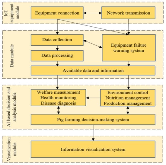 - The AI-based decision and analysis module contains pig health and welfare evaluation, disease diagnosis, environment control, nutrition and production management and a pig farm decision-making system. The pig’s welfare is usually expressed by the pig’s behavior [], and the pig’s health, welfare and disease diagnosis can be evaluated through a decision making-system using vision and sound signals. On the other hand, an AI-based decision-making system controls the operation of physical equipment involving environmental control and nutrition management to increase pig health and welfare, mainly based on the results of the above analysis [,].