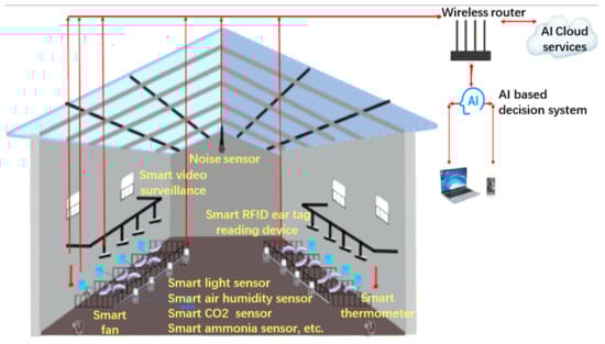 Precision pig farming uses technologies such as IoT and AI to continuously monitor pig health and welfare with the following main functions []: (1) The IoT is mainly used in the design and layout of temperature, humidity and other sensors, as well as associated networking equipment and data collection. The industrial Internet is mainly used to transmit the data to the server; AI and cloud computing are mainly applied to feature extraction, data analysis, modeling and decision-making [,,]. Here reliability is one of the keys to the early success of the deployment of precision pig systems [,]. (2) The intelligent analysis system transforms the data of animal response characteristics measured by cameras and microphones into key indicator information and analyzes them through AI and machine learning methods for the final decision of pig management []. (3) Optimize the production/reproduction process to avoid over-feeding, reduce farming waste and costs and make livestock farming more sustainable in economic, social and environmental aspects [,,]. The AI, IoT and smart sensors continue to drive the development and application of precision pig farming systems. A vision of precision pig farming technology implementation can be seeb in Figure 2 [,,].