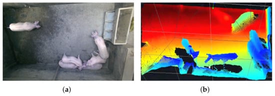 In pig weight prediction, 3D cameras are more beneficial than 2D cameras for estimating pig weight due to the extra depth information []. Kongsro et al. obtained the depth map and point cloud map (Figure 3b) of pigs using a Kinect 3D camera, which was then combined with machine learning technology to improve pig weight estimation accuracy []. Experiments have shown that the error of this method is estimated to be 4–5% of the average weight.