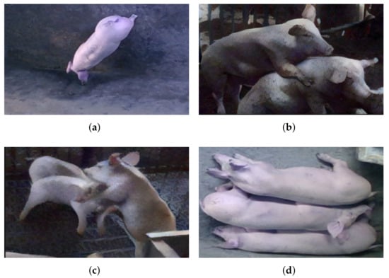 Pigs have different behaviors based on their living conditions. In most situations (normal environmental conditions), pigs perform daily behaviors, including drinking (Figure 5a), mounting (Figure 5b), aggression (Figure 5c) and laying (Figure 5d). These daily behaviors are important characteristics for judging a healthy diet and disease in pigs []. Table 2 shows the application statistics of AI vision-based pig behavior recognition. The following is a brief review of the different AI techniques used to identify pig behaviors.