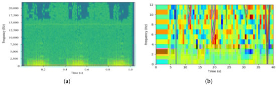 In terms of data preprocessing, as the pig cough sound spectrum illustrated in (Figure 6a), the environmental noise frequency band of pig farming is usually below 5 KHz, which overlaps with the pig cough sound frequency band [,,,]. In order to better remove fan noises in pig farming, Dong et al. proposed a Discrete Cosine Transform-based enhancement algorithm for pig cough sound signal denoising []. Yan et al. used the log energy entropy quadratic wavelet packet denoising method to remove piglets and pink noise; meanwhile, filters and wavelet thresholds were used to remove mechanical running noise [,]. Ma et al. used 150 order FIR filter band-pass filtering to effectively remove the noise outside the frequency band of pig cough sounds []. Additionally, Butterworth band-pass filter and multi-window spectrum-based psychoacoustic speech enhancement algorithms are also used to remove the noise [,,,,].