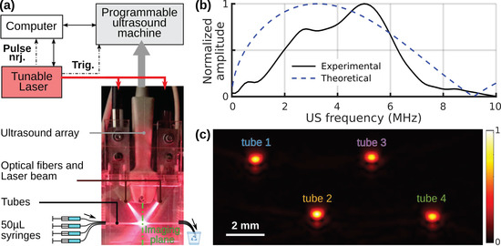 Experimental setup: (a) Annotated picture of the PAI system and schematic drawing of the experimental setup. The imaging plane of the array is perpendicular to the picture plane and perpendicular to the tubes. The laser beam was especially made visible for the picture with dust particles added in the water bath. (b) Experimental and theoretical frequency spectra of the PA-generated ultrasound signal. The experimental ultrasound spectrum was acquired with a tube filled with the calibration solution at 710 nm. The theoretical spectrum corresponds to Equation (A1). The spectra are normalized to their maximum values. (c) Image of 4 tubes filled with the calibration solution.
