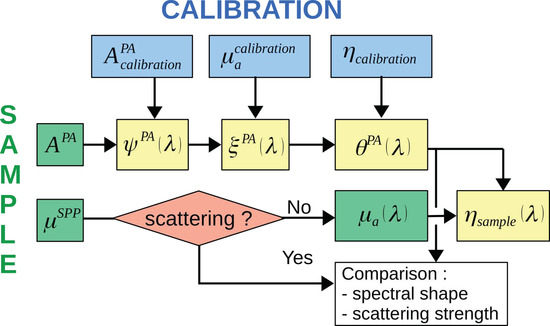 In our experimental setup, and Γwater are independent of the sample placed in the tube. Therefore, the sample-dependent factors of Equation (1) can be isolated in a quantity θPA(λ), named here the PA coefficient of the sample: