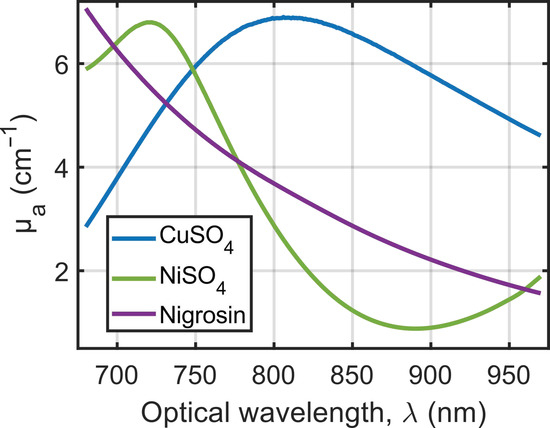 For the percent solutions of CuSO4 and NiSO4, and for the solution mix-SO4, the PGE was shown to be wavelength-independent in the range 740 nm to 980 nm [11]. For the percent solutions of nigrosin, the PGE is expected to be wavelength-independent for the range 680–980 nm. Hence, the spectra ξPA(λ) are expected to be directly proportional to the absorption spectra µa(λ), in the range where the PGE is constant.