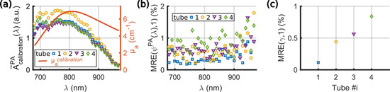 Repeatability of measurements with the calibration solution evaluated with 10 acquisitions. Different experimental conditions were applied for the 4 tubes. Tube 1: the solution was injected once. Tube 2: the solution was re-injected. Tube 3: the tube was flushed with air, and the solution was re-injected. Tube 4: the tube was flushed with air and water, and the solution was re-injected. (a) used for the evaluation of ΨPA for each tube and the absorption spectrum of the calibration solution. (b) Median relative error (MRE) of ΨPA vs. the optical wavelength λ for each tube. (c) MRE for the fitting factor of ΨPA by a flat spectrum of amplitude unity.