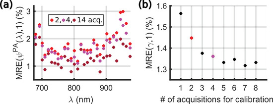 Evaluation of the influence of the number of acquisitions taken to compute the median of APAcalibration(λ). (a) Median relative error (MRE) of ΨPA vs. the optical wavelength λ for combinations of 2, 4, and 14 acquisitions out of 14 to evaluate the median of APAcalibration(λ) per tube. (b) MRE for the fitting factor for combinations from 1 to 8 acquisitions out of 14 to evaluate the median of APAcalibration(λ) per tube.