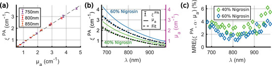 Linearity of the PA spectrometer with respect to the absorption coefficient µa and at different wavelengths. ξPA was computed for the 5 percent solutions of nigrosin and for 4 acquisitions in 4 tubes for each solution. (a) ξPA values (median ± MAD) as a function of µa for 3 different wavelengths and the 5 solutions. The dashed line is a fit by a homogeneous linear function of slope 0.79. (b) The left axis corresponds to ξPA values (median ± MAD) as a function of the optical wavelength for two solutions: 40% and 60% of the stock solution. The absorption spectra µa are displayed (right axis, solid line), as well as the fits. The proportionality factors were α40% = 0.81 and α60% = 0.80, respectively. (c) MRE of ξPA with α∙µa as a reference for the 40% and 60% percent solutions.