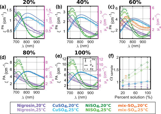 The PA spectra ξPA(λ) of the solutions of CuSO4, NiSO4, and nigrosin, as well as the solution mix-SO4, were measured at two different temperatures of the water bath: 20.3 °C ± 0.2 °C and 25.0 °C ± 0.2 °C. Samples with similar absorption were grouped together, and the groups were measured by ascending order of absorption. Each of the 16 samples was injected and measured twice in four tubes. The calibration solution was measured twice before and after each group, resulting in 12 measurements per tube to compute . The proportionality factors αsample were evaluated with a curve-fitting algorithm from . Figure 7a–e presents the spectra ξPA(λ) for the different groups of solutions, together with the fits and the measured spectra µa(λ). Figure 7f presents αsample as a function of the dilution percentage of the stock solution. The solution mix-SO4 was placed in Figure 7c (intitled 60%) due to the absorption values, but it was placed at 30% in Figure 7f because of the percentage of the stock solution of NiSO4 used.