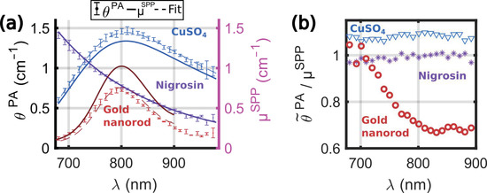 Experimental spectrum from a solution of gold nanorods (GNR). (a) PA coefficient θPA(λ) of the GNR solution (red curves), the 20% solutions of CuSO4 (blue curves), and the 20% solutions of nigrosin (purple curves) were measured once in four tubes. The median ± MAD values of θPA(λ) were displayed with dot markers and error bars. The attenuation coefficient µSPP(λ) is displayed with a solid line. For the GNR, the attenuation coefficient was only available in the range 680 nm–900 nm. The fits of µSPP to are shown with a dashed line of the same color as for θPA (λ). (b) Ratios for the different solutions as a function of the optical wavelength. The same colors as for θPA(λ) were used.