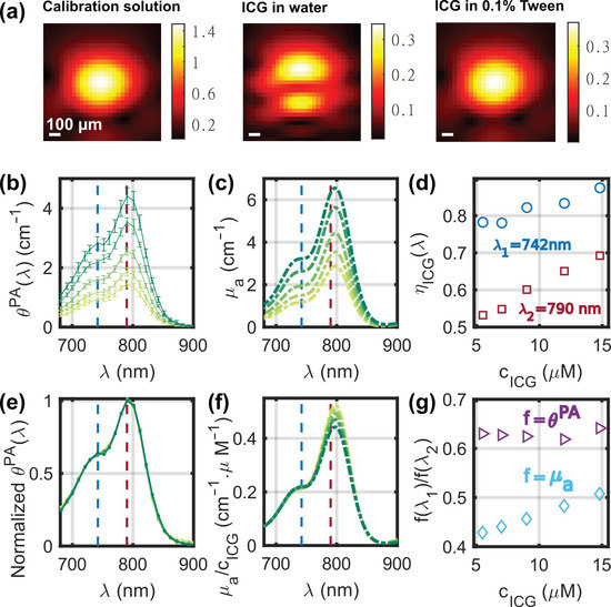 Experimental results for the solutions of indocyanine green (ICG). (a) PA images at 790 nm of a tube filled successively with: (left) the calibration solution, (middle) a solution of ICG in DPBS with 1% DMSO, and (right) a solution of ICG in DPBS with 1% DMSO and 0.1% Tween 20. The color scales are in arbitrary units. (b) PA coefficient θPA (median ± MAD) and (c) the corresponding µa spectra for the different concentrations of ICG. (d) Photoacoustic generation efficiency evaluated at two wavelengths, λ1 = 742 nm and λ2 = 790 nm, as a function of the concentration of ICG. (e) Median PA spectra of (b) normalized to their maximum value. (f) µa spectra of (c) normalized by concentration in ICG. For (b–f), the color of the curves changes from light green to dark green with increasing concentration. (g) Ratios θPA(λ1)/θPA(λ2) and µa(λ1)/µa(λ2) as a function of the concentration of ICG.