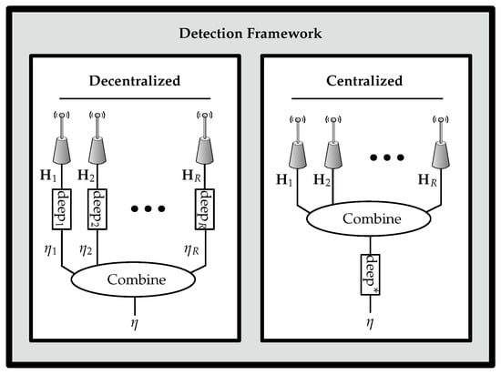 The proposed detection framework is illustrated in Figure 2 in which the CSI is estimated from multiple antennas. Based on the structure of the systems, multiple receivers, each with one antenna or a receiver with multiple antennas, we propose the following detection methods: (i) decentralized processing and the combination of anomaly scores; (ii) centralized processing with multi-channel extension of the detection algorithms. The blocks in Figure 2 termed “deep” represent either mixed or fully deep approaches.