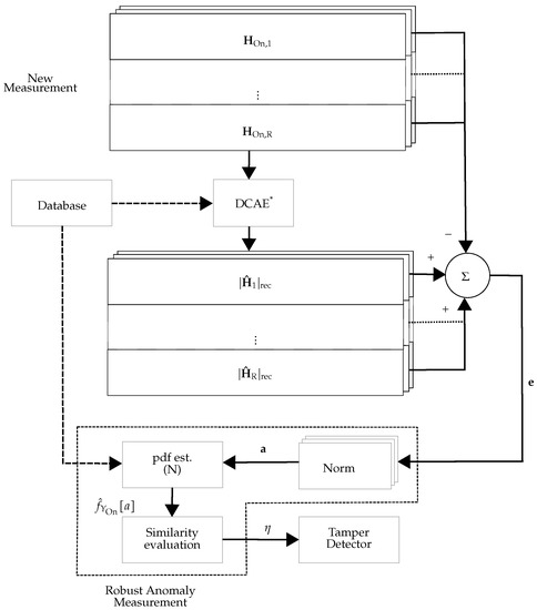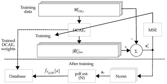 Here, we propose to use a single DCAE, which is capable of learning the combination of input data from all R receiver antennas. As shown in the subsequent sections, the size of the input for this structure is [, R, S]. This approach is also enhanced in terms of detection performance by utilizing a pdf estimator. In the offline phase (see Figure 5), the weights of DCAE* and its pdf estimation of the anomaly scores are stored in the database.