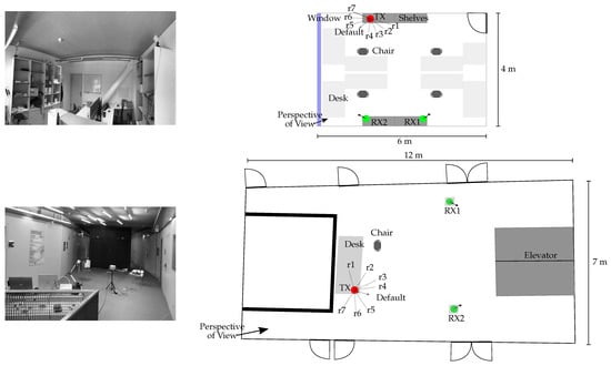 Measurement environments: (top) office (4 m × 6 m) and (bottom) hall (7 m × 12 m), depicted with photos and the layout. The transmitter (indicated by TX) and two receivers (indicated by RX1 and RX2) are denoted. Orientations r1, r2, …, r7 are considered as physical tamper attacks.