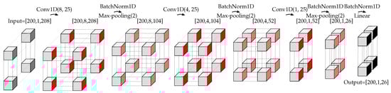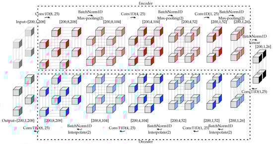 The DCAE-based methods require parameter selection for the DCAE core block (responsible for representation learning) and the postprocessing unit (responsible for anomaly detection). For the latter, the free parameter is the online batch size . For the DCAE, each convolutional module is composed of a one-dimensional convolutional layer followed by ELU activation functions (as depicted in Figure 9 with Conv1D), BatchNorm1D, and Max-Pooling layers. The transposed convolutional modules are composed of a one-dimensional transposed convolutional layer followed by ELU activation functions (as depicted in Figure 9 with ConvT1D), BatchNorm1D, and Interpolate layers. As depicted in Figure 9, the encoder is composed of three convolutional modules with different numbers of filters (eight, four, and one) and a final fully dense layer of 26 units. The mirrored structured is used for the decoder. The colors in Figure 9 show the operations that were applied. Dark red, light red, dark blue, and light blue color tensors illustrate that a convolutional module, BatchNorm1D followed by Max-Pooling, BatchNorm1D followed by Interpolate layers, and a transposed convolutional module were applied on the previous corresponding tensor, respectively. The black color tensor indicates the compressed representation of the input. The data flow starts from the top left-hand side and ends at the bottom left-hand side.