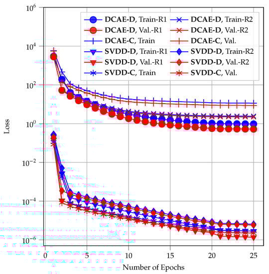 Figure 11 shows that the neural networks were appropriately trained. For an easier interpretation, the quadratic loss functions for Deep SVDD and the other DL methods are not normalized in the figure. Therefore, a shift between the learning curves of the Deep-SVDD-based methods and the DCAE-based methods is observed in Figure 11.