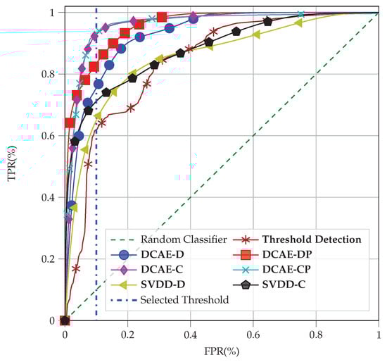 The comparison of the detection performance of the aforementioned methods is shown in Figure 12. In this work, similar to [7], we chose the threshold in Figure 12 such that it maximizes the TPR and minimizes the FPR in almost all methods, resulting in an FPR = 10%, which is indicated by the dashed-dotted line. As can be seen from Figure 12, the DCAE-based approaches have a better tamper attack detection rate compared to the Deep SVDD approaches. This is because they spend more effort on signal processing (representing the learned CSI and the postprocessing), which results in higher time and space complexity. As illustrated in Figure 12, DCAE-C and DCAE-CP have the best tamper attack detection rates. The Deep SVDD approaches have a better tamper attack detection rate compared to the threshold detection approach, although they have lower space complexity.