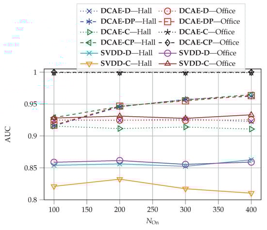 As brought up in [6], although the time delay will be longer by increasing the online batch size for DCAE-DP, the detection performance will be enhanced. Therefore, we investigated the impact of the online batch size on the detection performance. Figure 13 plots the AUC-ROC over different values of . Since significantly influences the performance of the pdf estimators, only the detection performances of DCAE-DP and DCAE-CP change over different values of . As expected, by increasing , the AUC-ROC improves. Note that the value of in the depicted range does not affect the performance of DCAE-CP in the office environment because the method can learn environmental variation very well. Obviously, the detection performances of the DCAE-based methods with postprocessing will be affected if the value of is chosen too small. According to Figure 13 and the relation between and time complexity, the optimal value of for DCAE-CP in the hall environment is 200.