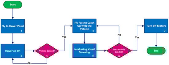 Our strategy for landing on a moving vehicle. The vehicle hovers above the road until it senses the passing vehicle. Then, it accelerates to catch up with the vehicle and tries to land using the visual servoing method. As soon as the landing is detected, all the motors are turned off.