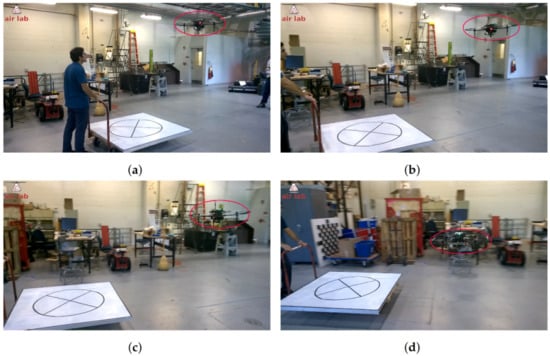 (a–f) Screenshots from a video sequence showing our quadrotor landing on a moving platform. In this experiment, the quadrotor is additionally equipped with a DJI Guidance sensor for safe operation in the indoor environment.