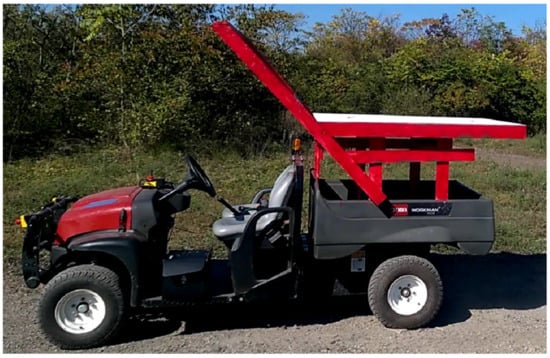 To test the system in the real scenarios, a Toro MDE eWorkman electric vehicle was modified to support the pattern at the height of m (Figure 9). A ferromagnetic deck with a painted landing pattern was attached to the top as the landing zone for the quadrotor.