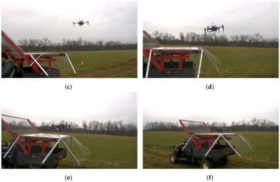 (a–f) Screenshots from a video sequence showing our quadrotor landing on the moving vehicle at 15 km/h ( m/s) speed. The video is available on our website.