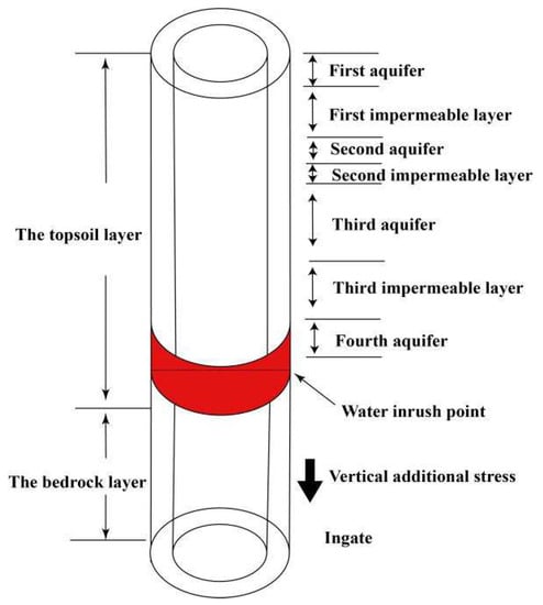 The reason for the damage to the coal mine borehole was that in the design of the underground building, the ingate and the cavern group of the auxiliary shaft were arranged in the mudstone stratum of poor rock strength at 730 m. As a result, the ingate and cavern group were deformed and damaged several times under earth pressure. After the accumulation of several destructive effects, the overlying strata was affected by repeated disturbances, and the stress state of the surrounding rock at the top of the ingate changed. The shaft wall was stretched by vertical stress and rupture occurred. Eventually, the fourth aquifer behind the shaft wall of this horizontal layer gushed into the shaft wall in a large amount. While the groundwater flooded into the shaft wall, it also carried a large amount of sediment, which damaged the lithology of the horizontal formation and caused the formation to sink. The subsidence of the strata further exerted additional vertical force on the shaft wall, which eventually resulted in severe damage and inclination of the auxiliary shaft []. The schematic diagram of wellbore damage is shown in Figure 1.