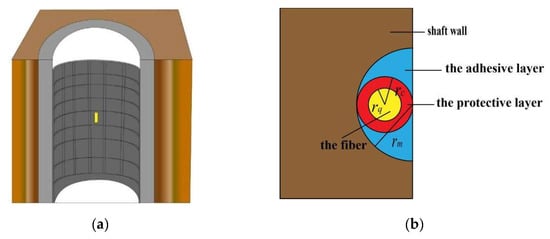 When a surface-mounted FBG sensor approach is used, both the protective and adhesive layers between the fiber and the shaft wall absorb part of the energy during the strain transfer process. This causes the strain on the shaft wall to deviate considerably from the strain sensed by the FBG. Therefore, it is necessary to establish a four-layer strain transfer structure model of the shaft wall consisting of the fiber, the protective layer, the bonding layer and the borehole wall and mechanically analyze the model to derive the strain transfer equation adapted to the shaft wall: the FBG model.