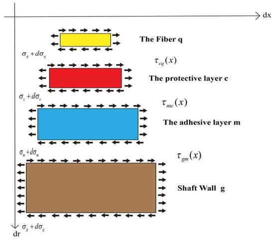 The following assumptions are made for the strain transfer model: (1) The fiber, the protective layer, the bonding layer, and the borehole wall fit each other tightly, with a complete contact surface and no relative slippage. (2) In the whole strain transfer model, only the borehole wall is uniformly strained along the fiber axial direction, and radial strain is not considered. (3) Due to the complexity of the environment, the adhesive layer could not fit into the engraved groove. However, for the convenience of analysis and calculation, the ideal state is assumed here, so that .Analysis of the forces on each layer in the strain transfer model. The analysis of the forces on each layer in the strain model is shown in Figure 4.