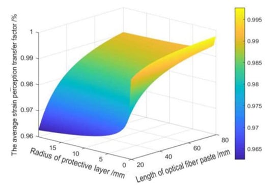 Effect of the length of FBG pasted and radius of the protective layer on an average strain perception transfer factor.