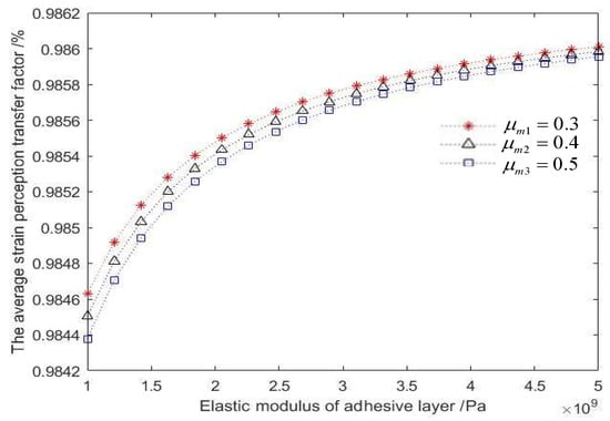 It can be seen from the analysis in Figure 7 that with the increase of the elastic modulus of the bonding layer, the average strain-sensing transfer factor also increases. However, it can be seen from the change in the numerical units of the vertical axis of the coordinate that the modulus of the bonding layer has little effect on the strain transfer effect. In addition, the smaller the Poisson’s ratio of the adhesive layer is, the better the strain transfer effect will be.