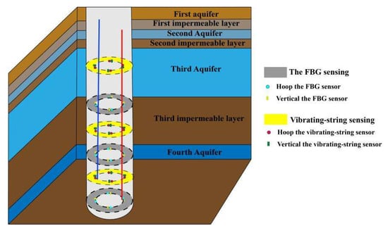The FBGs have temperature–strain cross-sensitivity properties. Therefore, to avoid the influence of temperature changes on the measurement accuracy of the FBG sensors, the common temperature compensation methods include the double parameter matrix method, the unstressed grating temperature compensation method, the polymer encapsulation method and the negative temperature material method. In this paper, the unstressed grating compensation method is adopted. Two FBG sensors are placed on opposite sides of each FBG monitoring level to measure temperature changes. We subtract the wavelength change of the compensation sensor from the center wavelength change of the working strain sensor to obtain the wavelength change caused by the strain of the shaft wall and achieve temperature strain compensation. The FBG and vibrating-string sensor arrangement of each layer is shown in Table 2.