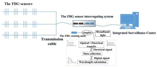 The FBG demodulation system is an essential part of the FBG sensing monitoring system. The grating wavelength demodulation technology can demodulate the spectral center wavelength variation into an intuitive physical parameter variation. Therefore, adopting the FBG demodulation system with fast demodulation speed and high precision in field industrial tests is necessary. The workflow is that the light emitted by the broadband light source enters the optical fiber through the coupler. Then, the light source is time divisionally incident on the FBG sensing channel through the optical switch to scan the FBG. The reflected light of the FBG sensors in each channel is time divisionally entered into the coupler through the optical switch. At this time, the stress change of the shaft wall is converted into optical pulse signals. After that, the optical pulse signals are converted into electrical pulse signals by the demodulator. Finally, after A/D conversion, it becomes digital signals and enters the data processing unit to complete the wavelength demodulation. In the sensing optical path and system circuit, the noise will inevitably be generated. Therefore, in the data processing unit, digital filtering and an improved peak-seeking algorithm will be used to improve the demodulation accuracy. However, under the effect of non-uniform transverse stress, the non-uniform strain will distort the wavelength of the FBG. Thus, a layer-peeling algorithm can be introduced into the data processing unit to calculate the complex coupling coefficient of each layered grating. In this way, the demodulation of the non-uniform strain of the FBG is realized.
