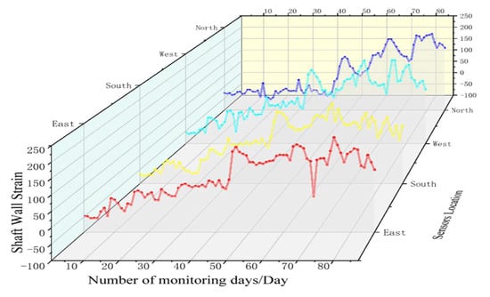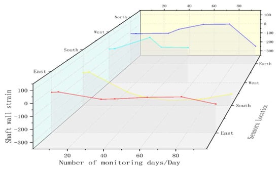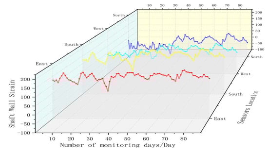 At the same time, the horizontal levels at 396 m and 640 m are selected to further verify the reliability and accuracy of the FBG sensor monitoring. Firstly, it can be calculated that the vertical strain of the shaft wall at 396 m is 72.484 and at 640 m is 103.1506 . Figure 12 and Figure 13 present the graphs of FBG sensing to monitor the strain variation of the shaft wall at 396 m and 640 m, respectively.