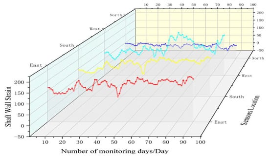 Factors such as thermal effects and residual strain during sensor installation will cause large errors in monitoring accuracy, so this problem needs to be discussed and overcome. Before installation, the FBG sensors are connected to the FBG demodulator for wavelength testing and recording. After each horizontal level’s sensor installation, the sensor’s wavelength test is tested again. Therefore, the center wavelength value of the fiber grating sensor in the system is zero-calibrated so that the data obtained by subsequent monitoring is the real strain value of the shaft wall.