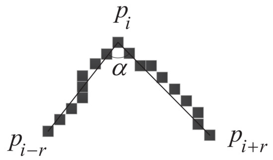Let denote the pixel points on the contour in Figure 2. Considering as the center point of a given contour segment, points , …, lay on its left and points , …, on its right, thus composing the whole contour. These points are the support region of the point . In Figure 2, the line segments , are called “support arms”, and is the “support angle” of the “support area”. Since the support region is a very small area, the support angle can be approximated: