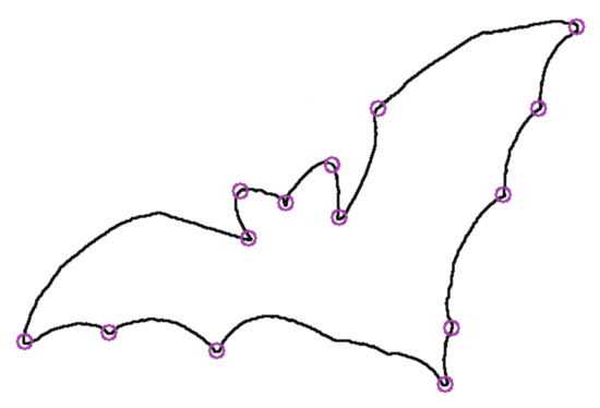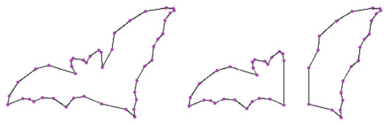 where . The higher the sharpness, the better the robustness of the point. The parameter r and the threshold T are selected by the bending degree of the contour. Parameter r is generally set to 3~15, and T is generally set to 0.05~0.15. Here, T and r are selected as , . The corner is detected as the starting point of the contour polygon segment approximation. Figure 3 is the contour segmentation by the corner for the object bat in the MPEG-7 data set [21]. Figure 4 is the bat divided into two parts to simulate different degrees of occlusion. Both Figure 3 and Figure 4 show that the segmentation of the remaining contours is affected by neither the contour completeness nor incompleteness.