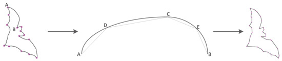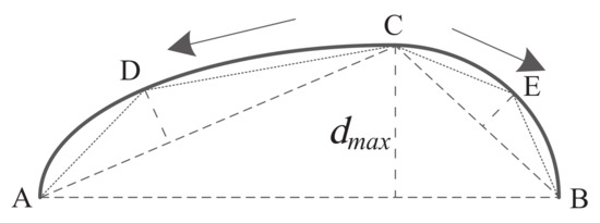 When the contours are segmented into segments by corners, each contour segment is estimated by the SM polygon-approximation algorithm. The variance of the contour starting point does not affect the subsequent contour segments for the polygon approximation compared with the approximation method of the entire contour. However, the distance threshold is used as the iterative stop condition for the SM algorithm, which results in a different number of vertices for polygons when the object scale varies. In order to improve the robustness of scale variance for the SM algorithm, the distance ratio and the arc length ratio as the stopping condition instead of the distance threshold are implemented into the PSM algorithm. Figure 5 is the process of the PSM polygon-approximation algorithm for the bat contour from pixel point A to pixel point B. The PSM polygon-approximation algorithm obtains four pairs of line segments as AD, DC, CE and EB.