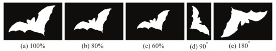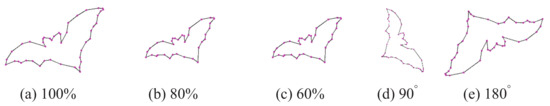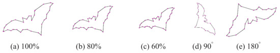 Figure 12a,c are the curves of the length and angle sequences extracted by the PSM algorithm for the bat with the three scales of , , and . Figure 12b,d are the curves extracted by the SM algorithm. The three curves for the bat with the three scales of 100%, 60%, and 90° are much more consistent in Figure 12a than those in Figure 12b. The same is the case for Figure 12b,d. Moreover, the trends of the two features extracted on the same contour are asynchronous. So the two features of angle and length would describe the contour polygon more correctly. In the simulations, the computer CPU is AMD Ryzen7 4899H 2.90 GHz and 8 G memory with Matlab R2016a, the running times are 0.12 s for the PSM algorithm, and 0.18 s for the SM algorithm.