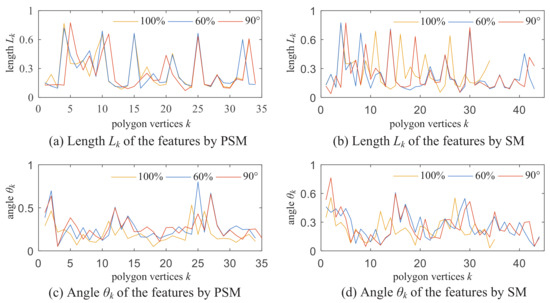 In order to verify the consistency of the length and angle feature extracted by the PSM polygon-approximation algorithm, Figure 12 shows the two feature quantity curves along the contour. The length and the angle sequences are extracted by the PSM algorithm and the SM algorithm for the bat object with the three scales of 100%, 60%, and 90°, respectively. The threshold of the SM algorithm is 4. The thresholds of the PSM algorithm are and in Equation (4).