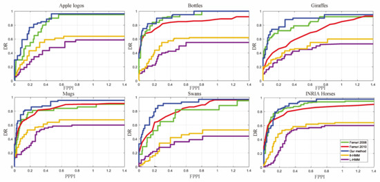 In the experiment, the standard datasets ETHZ Shape Classes [23] and INRIA Horses [24] were selected to verify the performance of PSM-CHMM. ETHZ Shape Classes contains 255 images of five categories of objects, including 40 apple logos, 48 bottles, 87 giraffes, 32 swans, and 48 mugs. The half images for every category as the training set are used to extract the contour feature sequence. The other half images are used as test sets. The INRIA Horses Dataset contains horse images in different scenes, including 170 images with horses and 170 images without horses. Fifty images with horses are used as the training set; the other images are used as the testing set. For the feature extraction process, the PSM threshold is . For the training process, The CHMM parameters are estimated by the EM algorithm. is considered to converge to the maximal value, when the increment of the estimated model parameters for two consecutive times satisfies to stop the training process. In the experiment, the single-chain -HMM and the L-HMM were trained with only one angle and length feature for object detection, respectively. Bounding box is the smallest external rectangle of the contour. The performance of PSM-CHMM also compares with the two contour-based methods by Ferrari [1,7]. The indexes of Detection Rate/False-Positive (DR/FPPI) per image are used to verify the performance. Figure 13 is the DR/FPPI curves for the six categories of objects in the ETHZ Shape Classes and INRIA Horses data sets. Table 2 shows the detection rates for FPPI on ETHZ shape classes and INRIA Horses.