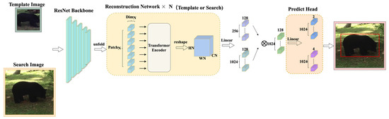 This section introduces the transformer tracker that refactors the patch. Our tracker contains four parts, as shown in Figure 2. The first part is the feature extraction backbone, ResNet50, and its input is a pair of pictures. This part divides the image into the template region pictures and the search region pictures after cropping and data enhancement and sends them to ResNet50 to extract features. The second part is the reconstruction network structure. It reconstructs the extracted features into a vector that the transformer encoder can receive and change as the existing transformer tracker sends the features extracted by ResNet50 to the transformer encoder in element-by-element patches, as shown in Figure 3. This process ensures the integrity of those features to a greater extent. In this part, we use a three-layer reconstruction network structure to enhance the features optimally. Its purpose is to calculate the characteristics of the search region and the template region to form a fusion vector for subsequent classification and regression operations. The fourth part is the predict head which calculates the fusion vector to get the regression bounding box result.