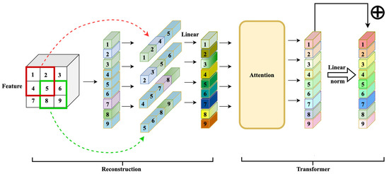 The attention calculation does not change the dimension of the input patch, but the spatial dimension of the feature map of the reconstructed patch becomes smaller each time. To ensure the use of the reconstructed patch for subsequent operations, we constructed a new patch. Afterwards, a fully connected layer ensured that the dimension remained unchanged. Therefore, the calculation formula for the entire reconstructed patch module was as follows: