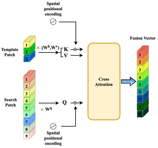 The difference between cross-attention and other attention operations is that the inputs q and kv of cross-attention come from two different branches. Here, we used the last extracted feature of the search region as the source of q in cross-attention and the last extracted feature of the template region as the source of q. The source of and is multihead cross-attention, so the calculation formula is as follows: