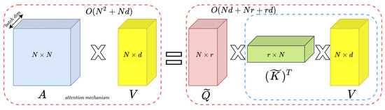 Equation (7) is the spatial complexity of the regular attention mechanism, and Equation (8) is the spatial complexity of the fast attention mechanism.