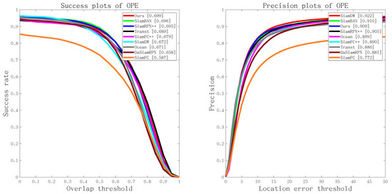 Please note that Transt is the latest sim-based tracker for cross-attention fusion vectors. SiamBan, SiamCar, SiamRPN++, SiamFC++, DasiamRPN, SiamFC, and Ocean are the latest Siam-based trackers for 2D intercorrelation operations. Figure 7 shows the overall performance of our method and other state-of-the-art tracking algorithms in terms of success rates and accuracy plots on OTB-100 [8].