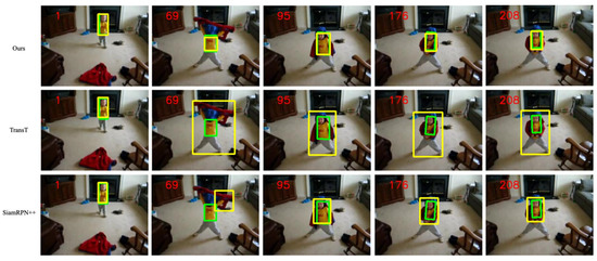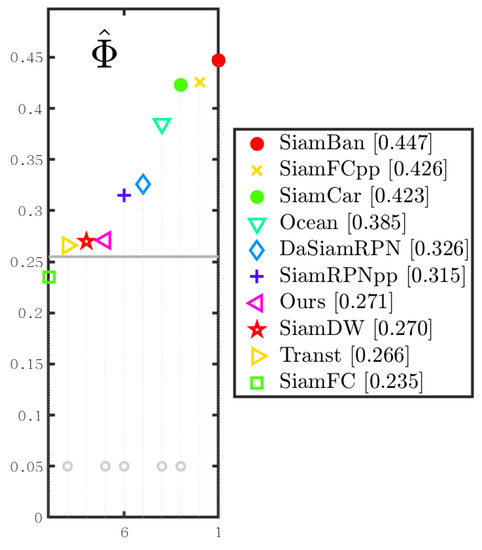 We compared the proposed trackers with nine state-of-the-art tracking algorithms on the VOT2018 dataset: Transt, SiamBan, SiamDW [42], SiamRPN++, SiamFC++, DasiamRPN, SiamDW, SiamFC, and Ocean. We evaluated the proposed methodology at VOT2018 and reported the results in Table 1. As shown in Table 1 and Figure 9, our method achieved an optimal EAO score of 0.271 and an optimal accuracy score of 0.594. Notably, our EAO score and optimal accuracy improved compared to Transt, setting up new and up-to-date technologies that show that our method can significantly reduce tracking failures of the cross-attention’s tracker.