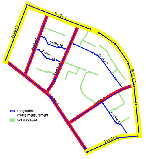 Similarly, to add profilometric measurements and calculate the IRI values, GIS tools allow the process to be simplified and the information overlaid. In particular, in this study, IRI values were calculated using a class I profilometer [60]. A Bluetooth GNSS sensor was placed on the top of the profilometer, which saves the location every three seconds and produces an output file directly imported into GIS. In this way, we obtained the representation of the trajectory followed during the field tests (represented by the arrows in Figure 6).